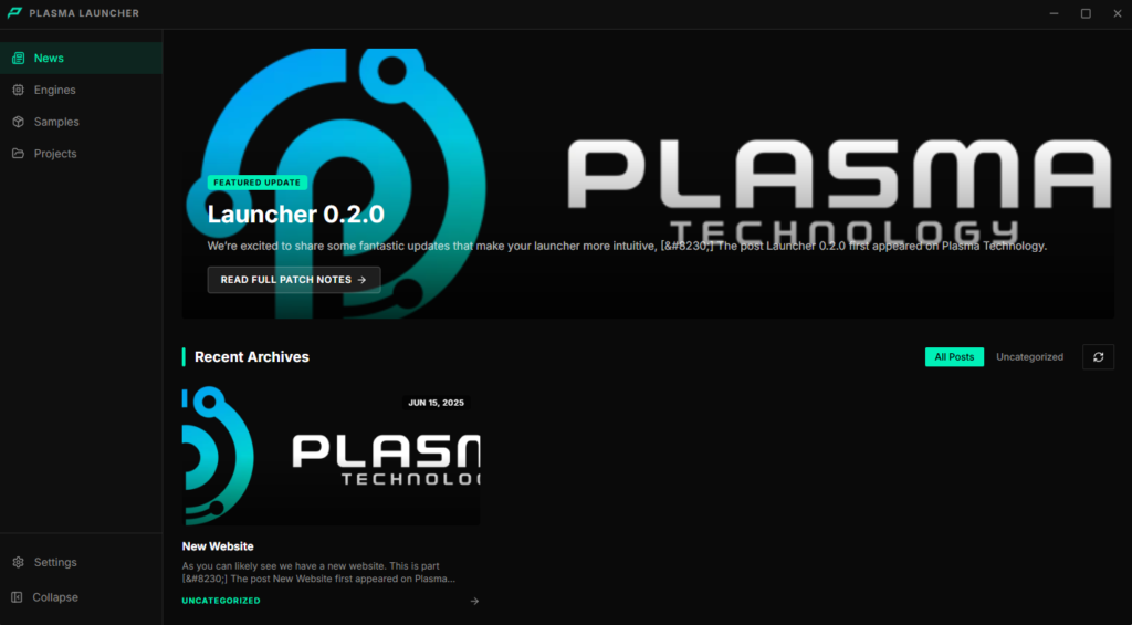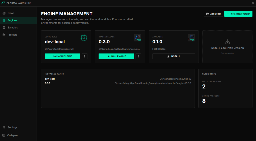 The Engine page has been completely re-imagined for clarity and ease of. This design focuses on providing you whats most important in a clear and concise format. This streamlined interface helps you install engine versions much easier along with keep tracks of important stats like number of engines and project. In future we hope to extend this with other useful information such as total file usage for all the content managed by the launcher.